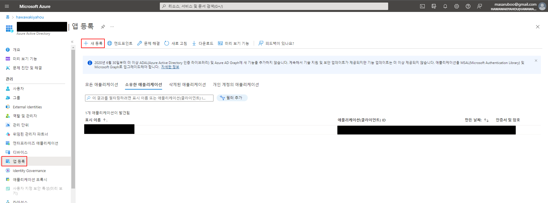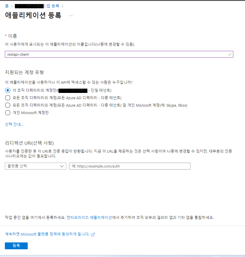 Azure Active Directory에서 앱등록 클릭하여 새등록을 클릭합니다.