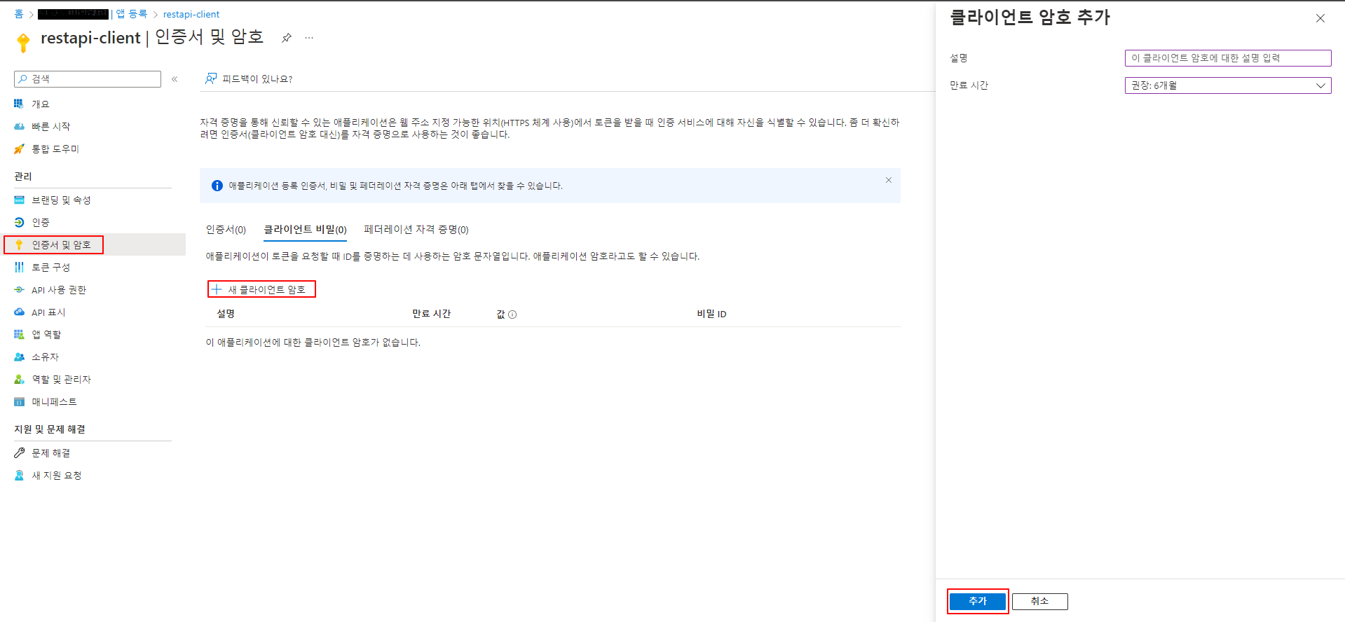 그리고 인증서 및 암호 메뉴에서 새 클라이언트암호 클릭 후 암호를 만듭니다.